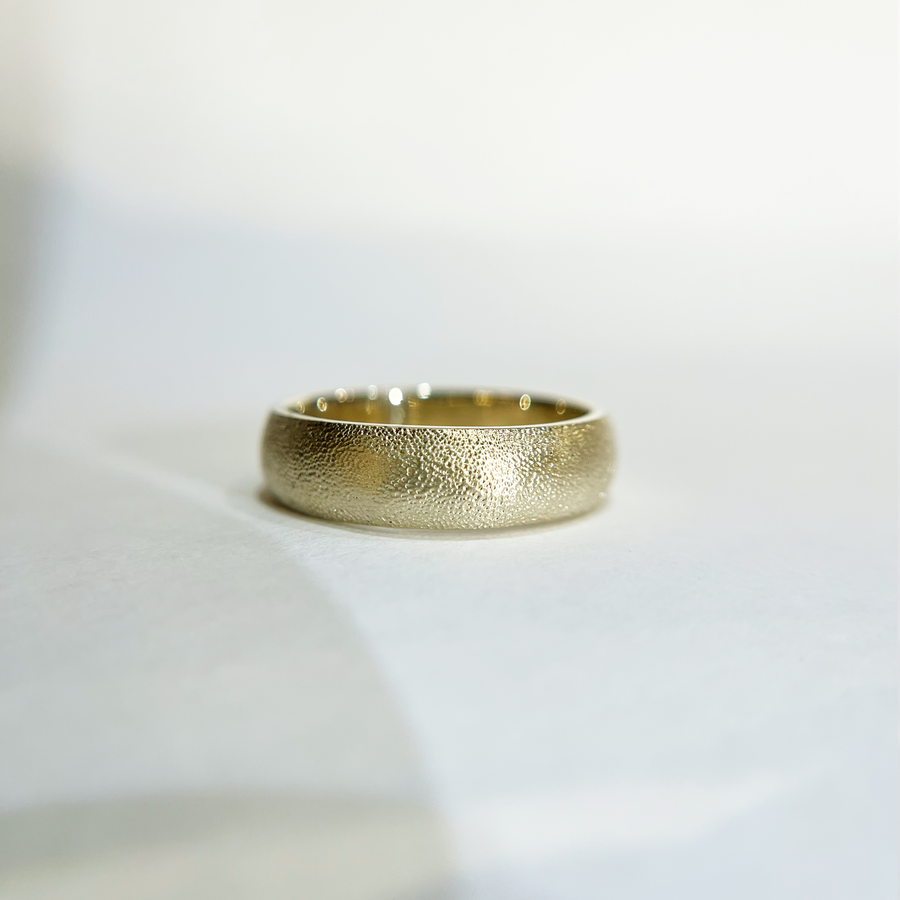 The Arancia Dolce band is a quiet nod to nature’s simplicity. Its 5.5mm width features a micro hammered texture, inspired by the gentle skin of an orange, with a soft satin finish that catches light in the most subtle way. The high-polished inner band offers a smooth, intimate contrast. Hand-carved from wax and polished with a beeswax solvent, the band carries a soft, natural scent of orange—an understated reminder of life’s sweetest moments.